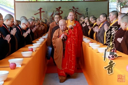 千僧斋,顾名思义,即同时布施一千名僧人之意。其起源应该始于目犍连尊者盂兰救母,供养十方结夏僧众。僧为三宝之一,是佛法的传播者,道由人弘,僧宝在即佛法在,因此供养僧人是大福德大功德的事。而且"凡是供千僧大斋之时,必定有一位罗汉降临应供",不过罗汉来应供,大多是现比丘相,混杂在大众僧人之中,凡眼不能识得罢了,所以是无比殊胜的。