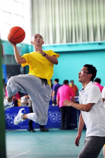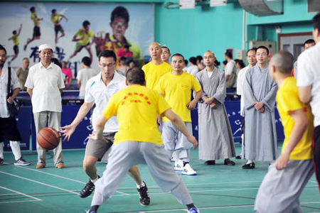 一名来自杭州市佛教协会代表队的选手在比赛中展现精湛的"少林篮球"技艺