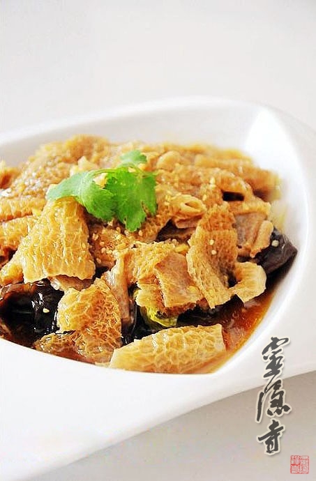 3、另起锅放入少许姜末放入竹毛肚加入少许水、加调料、调好味道稍煮一会勾少许芡汁淋上芝麻油出锅倒入盘中撒上白芝麻既可。