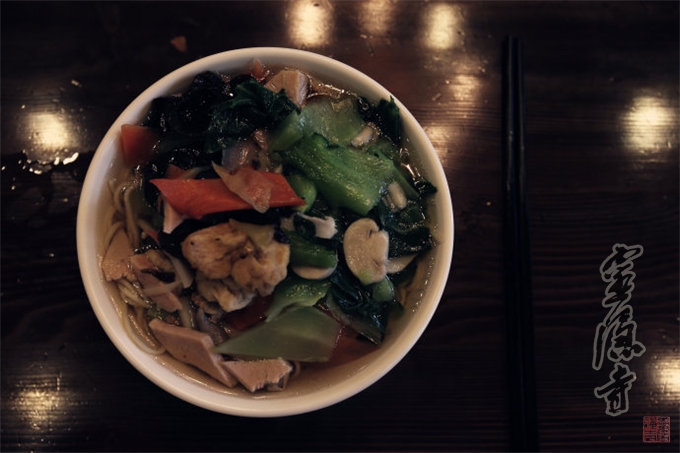 先来一碗"罗汉面"吧,捧着由素火腿、木耳、菌菇、胡萝卜及蔬菜精心制作的"罗汉面",眼及满碗的红红翠翠,耳闻佛音幽幽,菜蔬的清新与面食的鲜香扑鼻而来,鲜美汤汁在舌尖上留连宛转,入胃下肚的那一刹那,阵阵暖意从心头生起,全身每个毛孔都散发着一种莫名的舒爽。一碗"罗汉面"下去,五蕴六根都有一种美妙的感觉。
