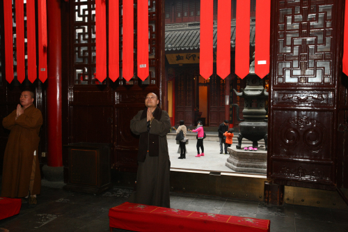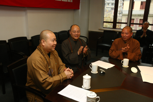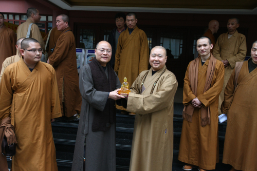 2011年12月6日下午,刚从北京培训结束归来的杭州市佛教代表团一行26人在杭州市佛教协会会长、灵隐寺方丈光泉大和尚的带领下来到上海玉佛禅寺参观。上海市佛教协会会长、玉佛禅寺方丈觉醒大和尚,市佛教协会驻会副会长周富根居士及玉佛寺寺务处主任等在觉群楼三楼会议室热情的接待了参访团一行。
