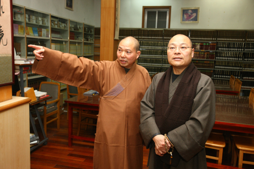 玉佛寺寺务处主任长春法师向光泉法师介绍玉佛寺图书馆