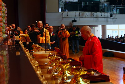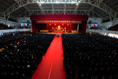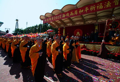 祈福法会在台湾南投县普台小学体育馆举行,中台禅寺开山方丈惟觉长老、中国佛教协会副会长学诚法师、杭州灵隐寺方丈光泉法师、台湾一新兰若知量法师及中台禅寺住持见灯法师,在佛前拈香祈福,共同主法,来自海内外15000名护法信众同声祷祝两岸和谐、世界和平。
