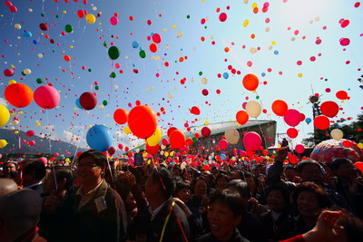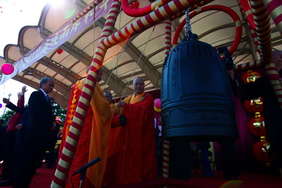 惟觉长老最后宣读"两岸祈福洪钟鸣,和平盛世共繁荣,风调雨顺民安乐,普天同庆坐太平",与学诚法师一同叩响和平钟,万名信众让手上象征和平心愿的环保气球高飞天际,传达希望世界和平心愿
