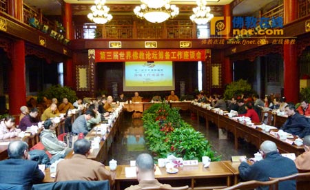 2012年2月13日上午,由中国佛教协会、香港佛教联合会、中华宗教文化交流会联合举办的"第三届世界佛教论坛筹备工作座谈会"在北京广化寺书院隆重举行。中国佛教协会副会长学诚法师、湛如法师,中佛协秘书长王健,中佛协副秘书长张琳、宗家顺、卢浔、胡雪峰喇嘛,北京市佛教协会副会长怡学法师,中国人民大学教授、中国佛教协会顾问方立天先生,国家宗教事务局副局长蒋坚永,国宗局一司司长徐远杰,国宗局副司长刘威、佛教处处长匡胜,国家宗教事务局办公室副主任赵磊、黄志辉,新闻处处长弋杨,国家宗教局政法司副司长焦自伟,政研处处长李寒颖,国家宗教局外事司副巡视员赵建政,香港佛教联合会执行副会长宽运法师、香港佛教联合会行政总主任张毅平、香港佛教联合会项目主任司徒基昌,《中国宗教》杂志社副主编胡绍皆,北京居士林林长夏法圣居士,南京大学教授圣凯法师,北京大学楼宇烈教授、李四龙教授,中国社会科学院宗教所杨曾文教授、黄夏年教授、魏道儒教授,北京师范大学徐文明教授,中国人民大学张风雷教授,中国佛教协会国际部主任普正法师、教务部主任宏度法师、寺庙办主任清远法师、综合研究室主任明杰法师、《法音》编辑部副主编陈星桥等在京的专家学者和有关部门的负责人近百人出席了会议。