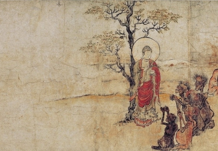 焰口,系根据《救拔焰口饿鬼陀罗尼经》而举行的一种佛事仪式。经中说:佛在迦毗罗城尼具律那僧伽蓝,为诸比丘并诸菩萨说法。尔时阿难独居闲静处习定。至夜三更,有一饿鬼,名曰焰口。于阿难前说:‘却后三日汝命将尽,生饿鬼中。’阿难心大惶怖,疾至佛所,陈说此事,并启示教。时佛为说无量威德自在光明殊胜妙力陀罗尼,谓诵之即能免饿鬼苦,福寿增长。修此法时,于一切时,取一净器,盛以净水,置少饭□及诸饼食等,右手按器,诵陀罗尼七遍,然后称多宝、妙色身、广博身、离怖畏四如来名号,取于食器,泻净地上,以作布施。若施婆罗门仙,即诵此陀罗尼二七遍,投于净流水中。若诵三七遍,奉献三宝,则成上味奉献供养。
