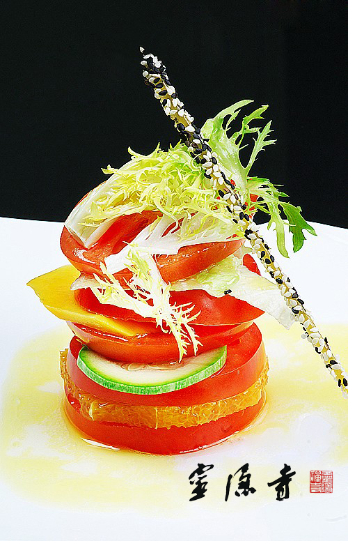 8.取盘,在盘子中央,依序叠上1片番茄片、2片半圆橙片、1片番茄片、3片西胡芦片、1片番茄片、2片芒果片、1片番茄片、放生菜片、1片番茄片,淋步骤7的法式淋汁,最后放入几片苦细叶和装饰棒即可享用。