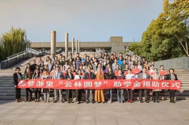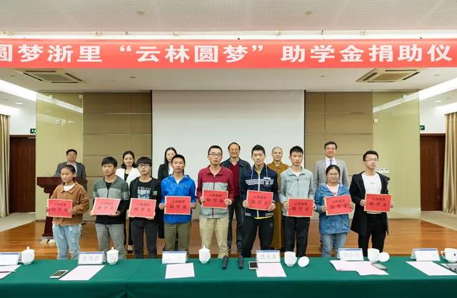 On November 4, 2017, a presentation ceremony for Yunlin scholarships and grants was held at Zijingang Campus of Zhejiang University by the Yunlin Charitable Foundation affiliated with Lingyin Temple to help university students complete their education. Those who attended the ceremony include the Director of Zhejiang Student Financial Aid Center Mr. Chen Longchun, the Director of Zhejiang Education Development Center Student Employment Office Mr. Zhu Weijun, the Secretary-General of Yunlin Charitable Foundation Master Zhengqin, the Director of Zhejiang University Student Affairs Department Mr. Wu Xiaocheng, and sixty sponsored students from eight universities in Zhejiang Province.