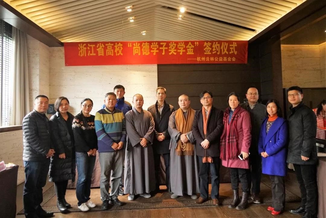 On December 13, 2018, the signing ceremony of Shangde(尚德) Scholarship for university students in Zhejiang Province was held by Hangzhou Yunlin Charitable Foundation(YLCF) at Lingyin Temple. Distinguished guests in attendance were the Director of the Religious Department of Hangzhou Municipal Bureau of Ethnic and Religious Affairs Mr. Hu Shengjun, the monastic supervisor of Lingyin Temple Master Zhiguang, the Deputy Executive Director of Hangzhou Yunlin Charitable Foundation Master Shengxian, as well as the representatives from eight universities in Zhejiang, including Zhejiang University, Zhejiang University of Technology, Hangzhou Dianzi University, etc.
