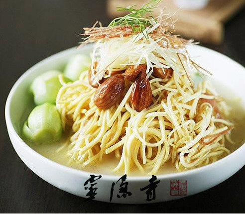 5、放入焯烫过的豆腐丝,再放入大杏仁,用大火煮约3分钟,最后放入青菜和盐即可。