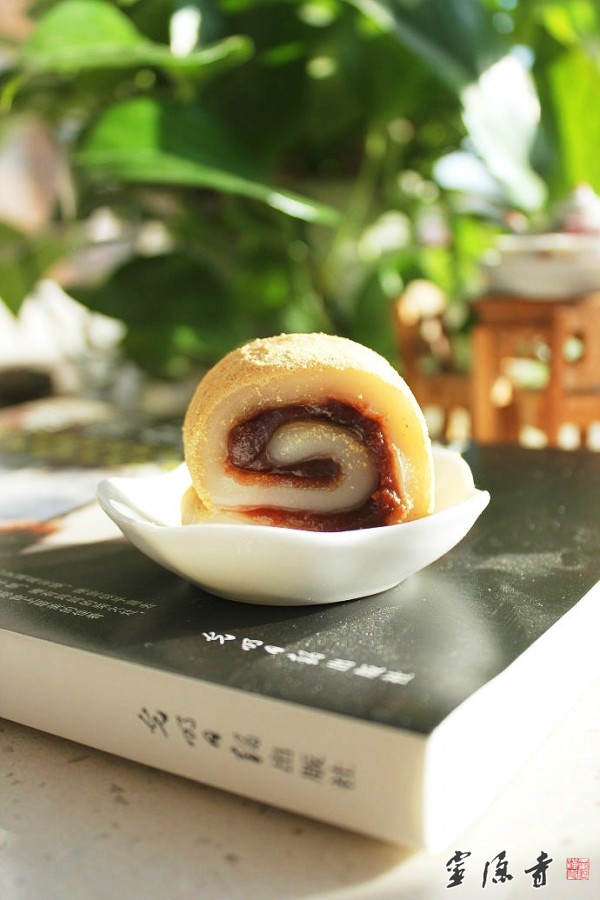 13,卷好的驴打滚放豆面中,表面沾匀豆面。