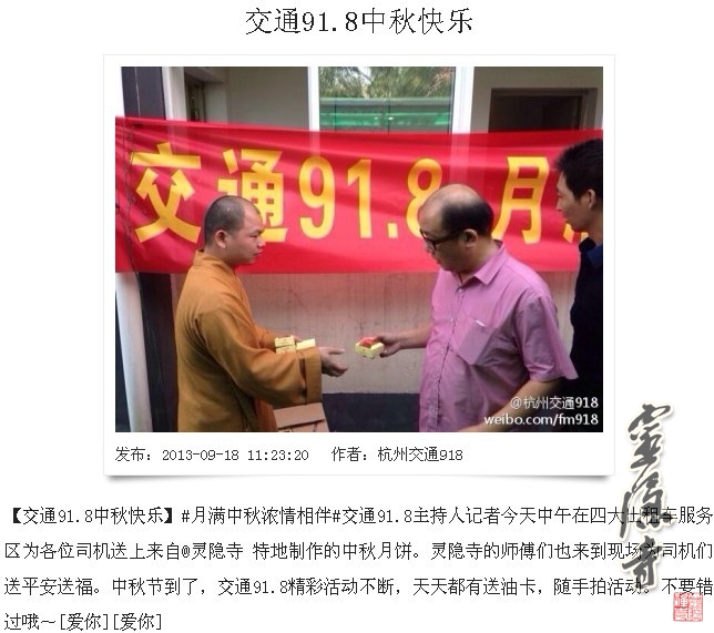 明天就是中秋佳节了,这是个千家团圆,万户赏月的日子,浓浓的亲情乡音,伴随着淡淡的月饼清香,早已弥漫了杭城的大街小巷。但是,在这个吉祥的日子里,还有许许多多的人们,还努力坚守在节日的工作岗位上,为我们的生活提供着各种各样的便利,辛勤忙碌的出租车司机们就是这样一个人群。今天,灵隐寺联合杭州"交通91·8"电台,前往杭州四大出租车服务区,看望这些为城市交通的正常运转不能回家团圆的司机师傅们,并亲手奉上灵隐寺特制的中秋净素月饼,带去了灵隐寺法师们的问候和三宝的真诚祝福,希望他们平安每一天,幸福每一分。