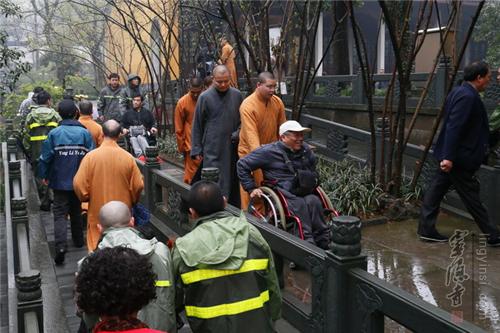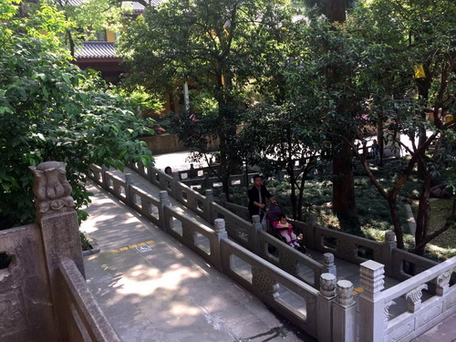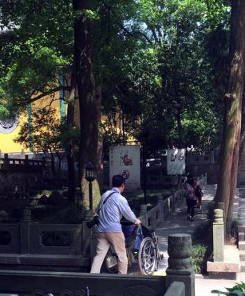 灵隐寺作为全重点寺院和世界文化遗产,每年都要接待几百万来自世界各地游客信众来寺观光旅游、朝圣礼佛。他们之中,有白发苍苍的老人,也有行动不便的残疾人。由于寺院里多有高低不等的台阶,他们只能走下轮椅,或者由亲友抬着轮椅走过一道又一道的台阶,也有人因此而止步于山门,望佛兴叹。