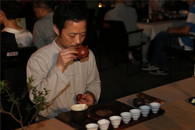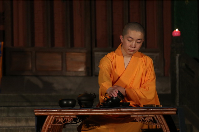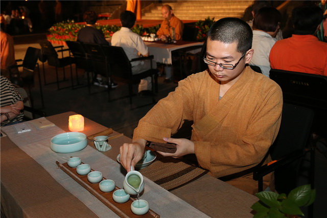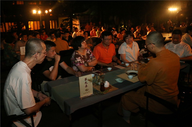 另一边,手中捧着法师、茶人用心泡出的茶,大家的身心随着茶叶渐渐舒展开来,用心感悟这茶中三昧。化解戾气,成就和气,这是一杯感恩的茶;茶叶片片,以甘香融入清水,润泽人我,这是一杯包容的茶。减一分私欲,增十分温馨,这是一杯分享的茶;为茶而来,为法而来,为缘而来,这是一杯结缘的茶……