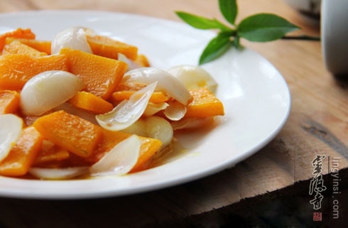 1、南瓜对半切开,削去外皮,挖出内瓤,切成薄厚适宜的片。