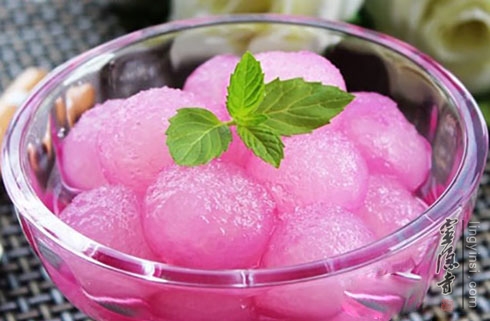 7、捞出焯好的冬瓜球,放入紫甘蓝汁中浸泡,放冰箱冷藏半个小时以上,吃的时候在上面撒些糖即可。
