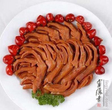 最后鸭掌烧好了,鸭子却还活着,切下鸭掌装盘上桌,鸭子做其它用。