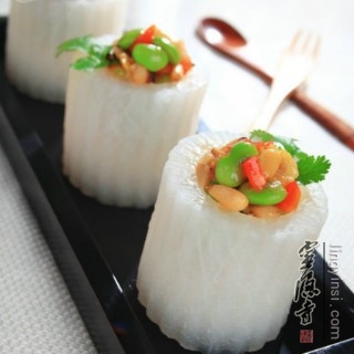 4.用汤勺在萝卜段中间挖一个凹洞为萝卜盅,放入盘中