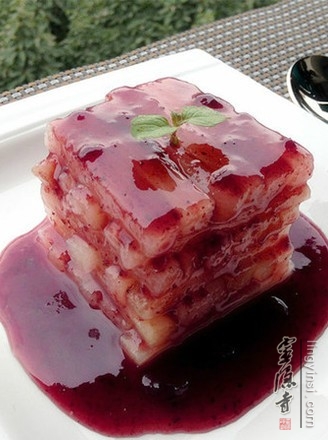 4.开始摆盘,一排横向的,一排纵向的摆,最后淋上蓝莓汁即可。