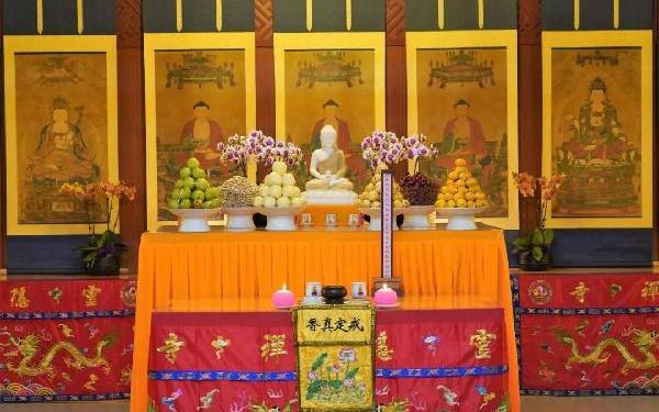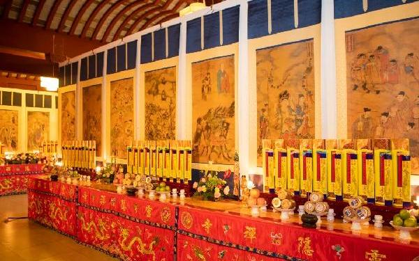 水陆法会是礼请十方法界众生听佛说法,并布施其斋食的一场盛会。水陆法会上的水陆画,即是法会仪轨中所礼请的对象,水陆画可以说是举行水陆法会不可或缺的圣物之一。水陆画悬掛于法会内坛,礼请对象分为上堂和下堂,上堂有十个席位,请的是诸佛菩萨和诸圣贤;下堂有十四个席位,请的是六道一切众生。换句话说,水陆法会礼请对象即法界四圣六凡,他们都在水陆画之中。上堂 水陆画共十席▲水陆画 西方极乐世界阿弥陀佛首席:一切诸佛。二席:一切尊法。三席:诸菩萨僧。四席:诸缘觉僧。五席:诸声闻僧。六席:持教法禅律诸宗。诸祖师僧。七席:助宣佛化。持明造谕五身通仙。八席:十大明王。秽迹金刚。诸大天王护法诸天。九席:护佛舍利坛塔。伽