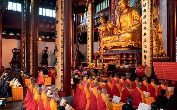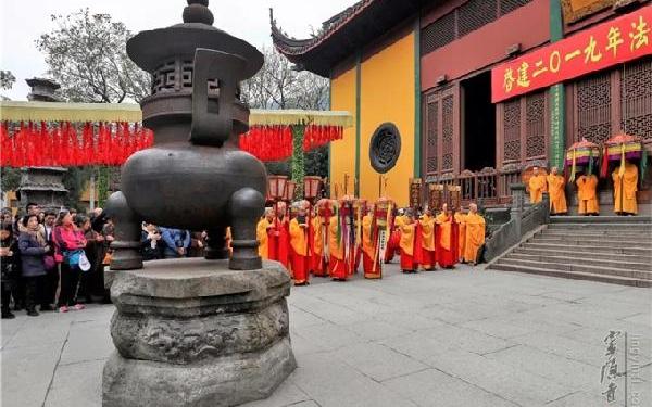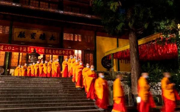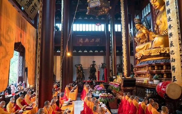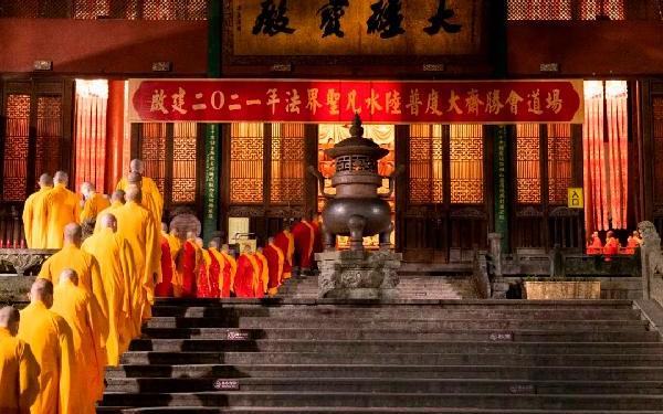 杭州灵隐寺辛丑年法界圣凡水陆普度大斋胜会2021年10月18日,农历九月十三,灵隐寺正式启建辛丑年法界圣凡水陆普度大斋胜会,为期一周,至农历九月十九观世音菩萨出家日(10月24日)圆满,伏愿世界和平,国泰民安,佛日增辉,法轮常转。10月19日,农历九月十四,灵隐寺辛丑水陆法会进入第二天。当日水陆法会的活动主要集中在外坛,大坛、华严坛、法华坛、楞严坛、诸经坛、净土坛六个坛场如法拜忏、诵经、念佛。华严坛(济公殿)默念《华严经》《华严经》,具名《大方广佛华严经》,是佛成道后在菩提场等处,藉普贤、文殊诸大菩萨显示佛陀的因行果德如杂华庄严,广大圆满、无尽无碍妙旨的要典。因其卷帙浩繁,义理深广,素有“经中