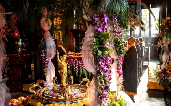 5月15日,甲辰农历四月初八,恭逢释迦牟尼佛圣诞,杭州灵隐寺于清晨举行甲辰佛诞浴佛法会,以此功德回向国运昌隆、正法久住,法界众生永离烦恼尘垢、速证清净法身!凌晨四点四十五分,杭州灵隐寺两序大众搭衣持具,整齐排班,闻磬声向上顶礼三拜后,同声称念“南无本师释迦牟尼佛”圣号,仪仗出班前往客堂,恭迎悉达多太子圣像。灵隐寺方丈光泉大和尚率众恭迎太子像至大雄宝殿,安座于满盛香水的九龙金盆之中。九龙吐水,沐浴金身。天上天下独为尊,七步宝莲生。威德光明,法界永沾恩。大雄宝殿内经声佛号,梵唱清扬,四众弟子同心感念本师释迦牟尼佛慈航倒驾,降迹娑婆;不恋王宫富贵,直趣雪岭修行,十九学道出家,三十降魔成佛;演经至五千