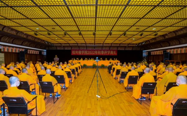 9月4日上午,杭州佛学院2022年秋季开学典礼在法云校区禅堂举行。浙江省民宗委副主任倪卫东,浙江省民宗委宗教三处处长郭家明,杭州市民宗局二级巡视员周晓明,杭州市民宗局宗教处副处长舒修明,浙江省佛教协会会长、杭州佛学院院长光泉法师,浙江省佛教协会副会长、杭州市佛教协会会长月真法师,浙江省佛教协会秘书长金幸祥,浙江音乐学院副院长杨九华教授、中国美术学院研究生处处长王一飞教授、杭州市佛教协会副会长智圆法师、念顺法师、演通法师、惟尘法师、圆诠法师,杭州市佛教协会秘书长胡胜军及杭州佛学院全体师生等出席了典礼活动。开学典礼活动由杭州佛学院副院长兼教务长戒法法师主持。▲开学典礼在庄严肃穆的升国旗仪式中拉开帷
