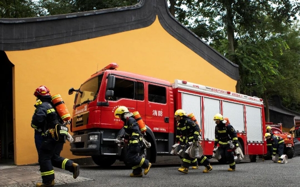 为进一步贯彻落实全省“除险保安”百日攻坚行动部署,高水平推进宗教活动场所平安建设,切实保障国庆长假期间寺院消防安全,9月22日,在灵隐景区消防救援大队的指导下,杭州灵隐寺组织消防安全演练。上午9时,随着模拟演习的警报声响起,灵隐寺消防队第一时间出动,排查险情发生位置,并上报消防部门,请求支援。景区消防闻讯即动,立刻赶到现场,与灵隐寺消防队联手,迅速扑灭火势,解除险情。整个过程大家行动果断、动作规范、配合密切,高标准完成演练的各项计划和要求,演练达到预期效果。演练结束后,景区消防救援大队教导员洪汝攀对演练过程进行了点评,现场检查了寺内各处消防设备、消防安全监控系统和紧急疏散通道,并对国庆期间寺院