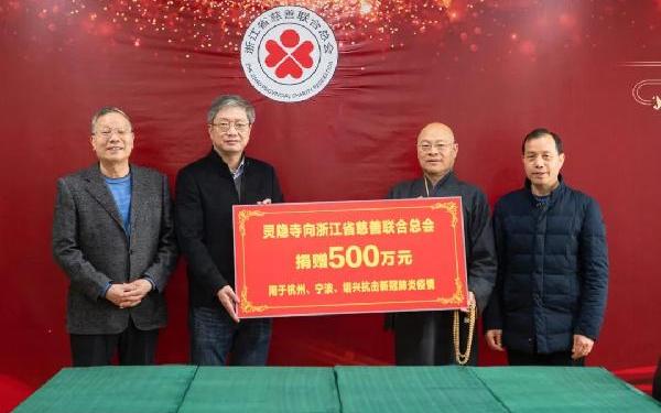 12月20日上午,杭州灵隐寺向浙江省慈善联合总会捐赠善款500万元,用于杭州、宁波、绍兴等地抗击新冠肺炎疫情。浙江省人民政府原副省长、党组副书记,浙江省政协原副主席、党组副书记,浙江省慈善联合总会会长陈加元,浙江省民政厅二级巡视员、浙江省慈善联合总会副会长兼秘书长蔡国华,杭州灵隐寺方丈光泉法师,浙江省佛教协会秘书长金幸祥等出席本次捐赠仪式。在捐赠仪式上,杭州灵隐寺方丈光泉法师向浙江省慈善联合总会捐赠善款500万元,浙江省慈善联合总会会长陈加元向灵隐寺颁发捐赠证书。光泉法师向奋战在抗击新冠肺炎疫情一线的所有工作人员表示敬意。他说,12月初以来,浙江省内三地的疫情防控工作牵动着大家的心,也牵动着杭