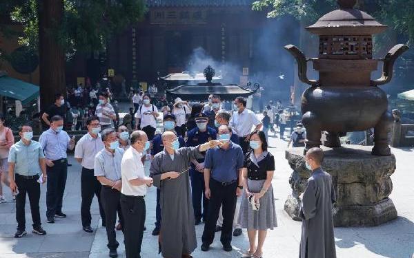 9月27日,杭州市政府丁狄刚副市长,杭州市政府副秘书长程华民,杭州市民宗局副局长唐明壮,市文广旅游局、市卫健委、市应急管理局、市消防救援支队分管负责人等,在灵隐寺方丈光泉法师的陪同下检查灵隐寺消防安全和疫情防控等工作落实情况。丁狄刚副市长一行在灵隐寺方丈光泉法师等的陪同下,先后实地查看了灵隐寺安全消防监控系统、厨房安全设施和疫情防控措施等。光泉法师介绍说:临近国庆节,灵隐寺一定抓好安全管控工作,平安护航中华人民共和国成立72周年,承担起保场所平安、保游客平安的责任。灵隐寺高度重视安全工作,通过组织消防巡查,疏通油烟管道,部署疫情防控安排等,以最严格的要求、最扎实的行动将国庆期间消防安全和疫情防
