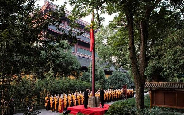 2021年10月1日,是中华人民共和国成立72周年纪念日。杭州灵隐寺隆重举行升国旗仪式。▲仪仗队护送国旗秋风送爽,云林桂香。清晨6时10分,升国旗仪式正式开始。杭州灵隐寺方丈光泉大和尚率两序大众着装整齐,排班肃立。▲升旗手以一道优美的弧线将国旗向上抛展伴随着雄壮激昂的国歌声,鲜艳的五星红旗冉冉升起。光泉大和尚带领僧众默唱国歌,行注目礼。大众注视着国旗在灵隐寺上空高高飘扬,满怀崇敬之情献上对伟大的祖国的美好祝福,共同祈愿国家繁荣昌盛,人民安居乐业。▲光泉大和尚带领僧众向国旗行注目礼在举行升国旗仪式前,光泉大和尚对于升国旗的意义作了简短的开示。他说,国旗是一个国家的象征,国歌是一个国家民族精神的体