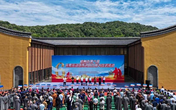 为扎实推进场所平安建设,积极开展“安全生产月”和消防安全“七个一”活动,着力提升和检验各宗教场所在消防安全标准化管理、防灾减灾和应急处置等方面的水平和能力,6月12日,由杭州市民宗局、杭州市消防救援支队主办,杭州市佛教协会、杭州西湖风景名胜区消防救援大队协办,杭州佛学院承办的杭州市第六届宗教活动场所消防技能大比武活动暨第九届杭州佛教消防技能大比武在杭州佛学院举行。杭州市委统战部副部长、市民宗局局长俞雪坤,杭州市消防救援支队支队长何肇瑜,市民宗局副局长陶胜以及杭州市级五大宗教团体负责人出席活动开幕式,各级民宗和消防部门负责人、市级宗教团体及市属宗教活动场所主要负责人和安全负责人、24支代表队参赛