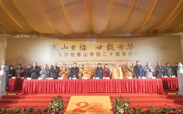 2023年12月16日上午9时,江苏佛学院寒山学院二十周年校庆在苏州重元寺隆重举行,中国佛教协会副秘书长、浙江省佛教协会会长、杭州佛学院院长、灵隐寺方丈光泉法师应邀出席。领导嘉宾、诸山大德、历届校友等500余人齐聚阳澄湖半岛,在雄壮的国歌声中见证这一历史时刻。光泉法师作为兄弟院校代表,首先祝贺江苏佛学院寒山学院成立20周年。他强调,僧伽教育是基业,如今正处百年未有之大变局,佛教院校必须有更高的站位、更广的视野、更深的思考、更实的举措、更强的自信,才能不断推进佛教教育的创新和发展。他希望以此次活动为契机,加强佛教院校之间的相互协作,共同进步,丰富人间佛教理念,将中国佛教僧伽教育与办学水平不断推向