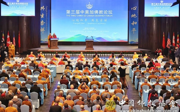 初冬的杭州,东篱菊艳,层林尽染。2023年11月15日至17日,第三届中美加佛教论坛在中国浙江杭州举行。来自中国、美国、加拿大三国佛教界代表及各界嘉宾近三百人,齐聚钱塘之畔,共赴径山之约。本次论坛以“心地和平,共生吉祥”为主题。佛教《心地观经》认为,“众生之心犹如大地”,《楞严经》中说:“当平心地,则世界地一切皆平”。15日上午8时许,三国佛教界在径山寺大雄宝殿佛像前共同举行祈祷世界和平法会。9点,论坛隆重开幕。国家宗教事务局局长、中华宗教文化交流协会会长陈瑞峰出席开幕式并致辞。他表示,中美加佛教论坛建立了三国佛教界交往合作新机制,开创了三国民间友好交流新模式,已经成为中美加三国宗教文化交流的