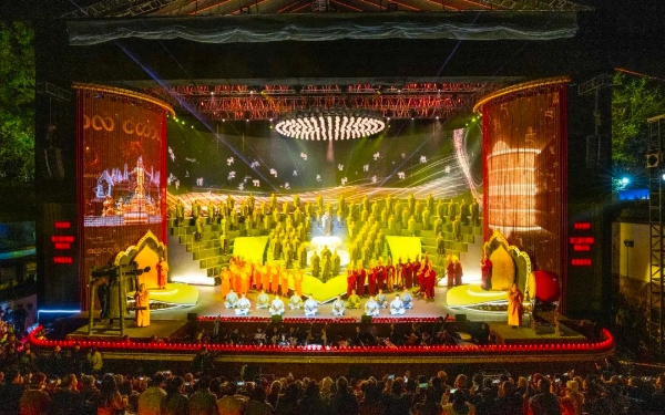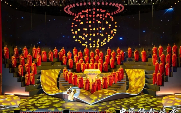11月16日晚,共生吉祥——第三届中美加三国佛教论坛专场音乐会在杭州灵隐寺紫竹广场举行,来自中国、美国、加拿大三国的佛教界代表和各界嘉宾共同欣赏了一场跨越时空国度、展现当代价值的中华优秀传统文化盛宴。伴随着中国佛教汉传、藏传、南传三大语系法师们的唱诵祈福,音乐会拉开了帷幕。整场晚会以“共生吉祥”为主线,共分为三个篇章。第一篇章“源”一开场,“洪钟初叩,宝偈高吟……”悠扬的《叩钟偈》声迅速将观众的思绪带入到千年古刹晨钟暮鼓的清净氛围中,在歌咏偈赞中感受着作为中华佛教文化的源远流长和勃勃生机。第二篇章“缘”以近代高僧弘一大师填词、美国作曲家约翰·庞德·奥特威作曲的《送别》开篇,优美的旋律见证了两国