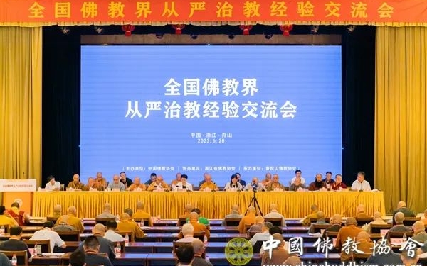 坚持教风建设是佛教自身建设的根本。坚持全面从严治教是当前中国佛教健康发展的必然要求。为总结经验、分析不足、巩固成果、谋篇布局,将全面从严治教工作引向深入。2023年6月28日,由中国佛教协会主办、浙江省佛教协会协办、普陀山佛教协会承办的全国佛教界从严治教经验交流会在浙江舟山举行。中央统战部相关部门负责人、中国佛教协会会长演觉法师出席会议并讲话。浙江省委统战部副部长、省民宗委主任鲍秀英,舟山市委统战部常务副部长刘丹恺,中国佛教协会副会长、普陀山佛教协会会长道慈法师参会并致辞。中国佛教协会副会长圣辉法师、永寿法师、明生法师、正慈法师、宗性法师、普法法师、静波法师、胡雪峰喇嘛、怡藏法师,中国佛教协会