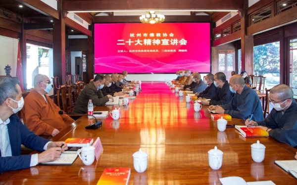 11月10日,杭州市佛教协会七届理事会召开第一次常务理事会议专题学习党的二十大精神。会议邀请杭州市民宗局党组成员、二级巡视员周晓明宣讲二十大精神,市佛协七届理事会全体常务理事参加学习,会议由市佛协会长月真法师主持。▲会议现场▲杭州市民宗局党组成员、二级巡视员周晓明作专题宣讲周晓明指出,佛教界要充分认识、深刻领悟党的二十大胜利召开的重大意义。党的二十大是在全党全国各族人民迈上全面建设社会主义现代化国家新征程、向第二个百年奋斗目标进军的关键时刻召开的一次重要大会,事关党和国家事业继往开来,事关中国特色社会主义前途命运,事关中华民族伟大复兴。大会明确宣示了党在新时代新征程上举什么旗、走什么路、以什么
