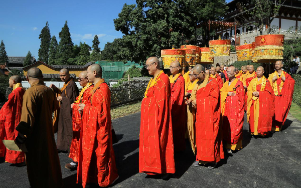2018年7月15日,恭逢韦陀菩萨圣诞日。"第二届径山禅宗祖庭文化论坛:佛教中国化发展暨山门落成天王殿佛像开光法会"在韦陀菩萨道场径山万寿禅寺隆重举行。 浙江省、杭州市有关部门领导、海内外诸山长老、专家学者、护法檀越等千余人,共同见证盛会。礼请诸山长老、高僧大德步入会场 上午9时,钟鼓齐鸣。径山万寿禅寺两序大众至诚礼请心澄法师、正慈法师、宗性法师、诏祜巴等傣、宏度法师、光泉法师、秋爽法师、戒兴法师、向学法师、长顺法师、允观法师、明杰法师、月真法师、诚信法师、贤宗法师、瑞印法师、妙峰法师、悟端法师等共同为天王殿佛像开光主法。诸山长