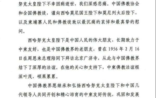 惊悉中国人民的伟大朋友、柬埔寨人民的卓越领袖西哈努克太皇陛下不幸因病逝世,我们深感悲痛。中国佛教协会和全国佛教徒,谨向西哈莫尼国王陛下和莫尼列太后陛下,以及柬埔寨人民和佛教徒致以最沉痛的哀悼和最真挚的慰问。