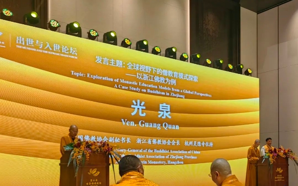 全球视野下的僧教育模式探索——以浙江佛教为例浙江省佛教协会会长,杭州灵隐寺方丈 光 泉尊敬的各位领导、法师、专家学者、来宾朋友们:大家好!今天,我们欢聚一堂,隆重举行“第六届世界佛教论坛“,可谓因缘殊胜、法喜充满!在此,我谨代表浙江省佛教协会、杭州灵隐寺向各位领导、法师、专家学者的莅临表示最热烈的欢迎和最诚挚的问候!一、中国佛教教育的发展史教育是文明传承和发展的重要途径。佛教之生存,在演经布教;弘法利生之关键在人才;人才之培养在教育。纵观历史,中国佛教教育经历了译场教育、丛林教育、讲肆教育和学院教育。佛教传入中国后,其最早发端于佛经的翻译,通过建立译场,讲学育才,培养佛学研究人才和翻译人才。