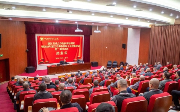 12月6日下午,浙江省重点寺院执事培训班暨2024年浙江省佛教教职人员省级轮训第二期培训班在中央社会主义学院(北京)结业。浙江省佛教协会会长光泉法师出席结业式并讲话。光泉法师在讲话中向这次培训班的授课老师,向浙江省、杭州市佛协以及灵隐寺的工作团队,向来自全省各地的重点寺院执事表示衷心感谢。光泉法师指出,佛教作为中华优秀传统文化的重要组成部分,承载着深厚的历史底蕴和精神内涵,对社会的和谐稳定、人们心灵的滋养启迪,始终发挥着重要作用。希望大家回去后,要学以致用,拓宽视野,提高站位,从宏观层面认识世界的发展趋势以及我国所处的历史方位,明晰佛教在当前时代背景下所面临的机遇与挑战,引导信众正信正行,积极