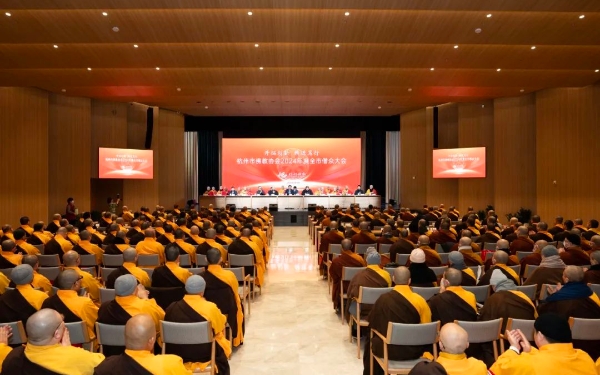 为深入学习贯彻习近平新时代中国特色社会主义思想和党的二十届三中全会精神,全面总结杭州佛教2024年工作成绩,部署2025年重点工作。1月8日,杭州市佛教协会在杭州国际佛教文化交流中心召开2024年度全市僧众大会。省民宗委党组成员、副主任邵中,市委统战部副部长、市民宗局局长俞雪坤,省佛教协会会长、市佛教协会名誉会长光泉法师,市佛教协会会长月真法师出席大会并讲话。省市统战、民宗部门相关领导,市佛协领导班子成员,各区、县(市)佛协会长在主席台就座。全市各寺院僧众、杭州佛学院师生等400余人参加大会。会议在雄壮庄严的国歌声中拉开帷幕。市佛协常务副会长戒兴法师主持会议。市佛协副会长戒清法师传达学习中央政