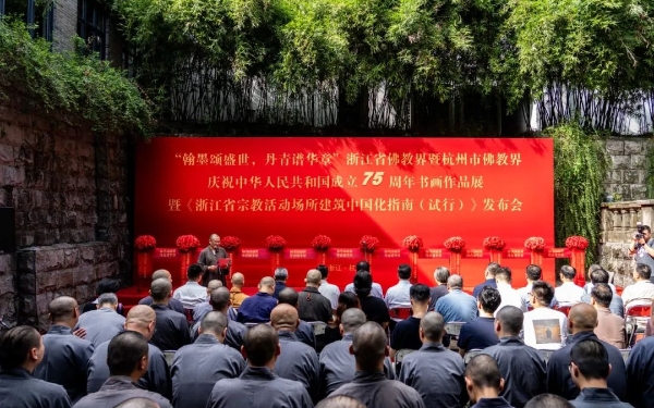 9月14日上午,由浙江省民宗委、杭州市民宗局指导,浙江省佛教协会、杭州市佛教协会联合主办的“翰墨颂盛世,丹青谱华章”浙江省佛教界暨杭州市佛教界庆祝中华人民共和国成立75周年书画展在杭州国画院美术馆开幕。浙江省民宗委副主任、一级巡视员陈振华,中国美术学院书法学院院长陈忠康,杭州市民宗局副局长陶胜,浙江省佛教协会副会长诚信法师,浙江省佛教协会副会长、杭州市佛教协会会长月真法师,华东师范大学美术学院书法系主任张索,浙江书法院副教授林峰,华东师范大学美术学院副教授、中国美术学院书法学院硕士研究生导师王客,杭州市佛协副会长智圆法师、戒清法师、念顺法师、圆诠法师、秘书长胡胜军、常务副秘书长邓安松以及杭州市
