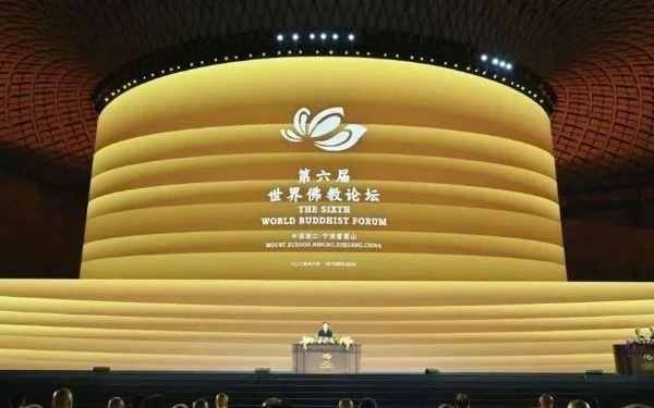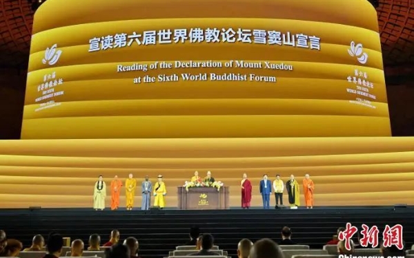 由中国佛教协会、中华宗教文化交流协会主办的第六届世界佛教论坛17日在浙江宁波闭幕。雪窦山下,中外高僧大德、专家学者沟通对话,热议佛教文化精髓、思想内涵,推动文明交流互鉴。世界佛教论坛,是由中国发起主办的国际性佛教多边交流对话机制,过去五届,活动足迹遍及两岸及香港。10月17日,第六届世界佛教论坛闭幕式在浙江宁波举行。图为闭幕式上宣读第六届世界佛教论坛《雪窦山宣言》。中新社记者 赵文宇 摄过去三天,来自72个国家和地区的佛教界人士、专家学者和嘉宾代表等约800人出席论坛。论坛以“同愿同行·和合共生”为主题,由开幕式、主论坛、7场分论坛、新媒体论坛、电视论坛、闭幕式等主要活动,以及佛教文化主题展览