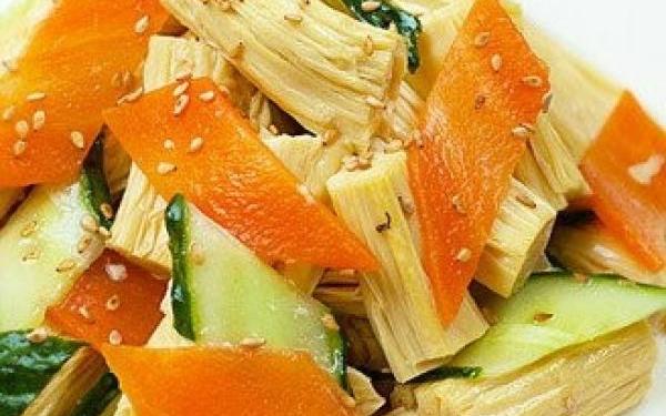 【主材】:腐竹、白芝麻、植物油、食盐、香油、白糖、麻油。【制作】:1、将腐竹放入碗中,倒入少许温水略浸半分钟,沥去水,切成长段。2、黄瓜洗净,斜刀切分成几段,取一段黄瓜平放到案板上。3、刀从右侧直切,再隔2毫米左右从右至左陆续切下,即切成象眼片。4、胡萝卜洗净,去皮,同样切成象眼片,煮锅中倒入适量水,水开后放入少许盐、几滴植物油,放入胡萝卜片,煮熟后捞出用凉水冲洗,沥去水。5、将腐竹、黄瓜、胡萝卜都放入大碗中,放入盐、味精和白糖,用手抓拌均匀。6、放入香油、麻油拌匀,盛入盘中,撒熟白芝麻点缀即可 。