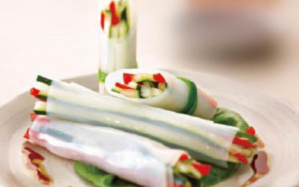 【主材】:黄瓜、甜面酱、芝麻油、鲜酱油【制作】:1、将黄瓜刨去外皮,切成小段。2、淀粉加水调成面糊,倒入平底盘内;将粉皮在沸水中煮熟,盛出后晾凉待用。3、将黄瓜段及红椒丝卷入粉皮中,芝麻油、鲜酱油、甜面酱,拌匀即可食用。