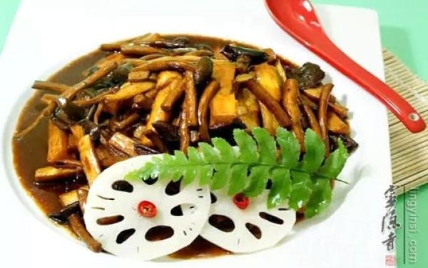 【原料】:茶树菇、茭白 【制作方法】: 1、茭白洗干净,切条状(切滚刀块也可以)待用。 2、茶树菇改刀成段,洗干净待用。 3、起锅,倒入精制油,待油温升至4成热放入茭白条拉油,表面成淡金黄色后捞起。原锅油温升至6成热,倒入茶树菇拉油,至茶树菇水分基本收干后倒出,沥干油。 4、锅留底油烧热,放入姜块煸香,倒入茭白、茶树菇,再加老抽、糖、和适量水,用小火焖烧,微火慢慢烧2小时左右。然后捞出生姜块,改用大火收至水分,加蘑菇精快要收干时勾一点点薄芡,淋些芝麻油装盘即可。