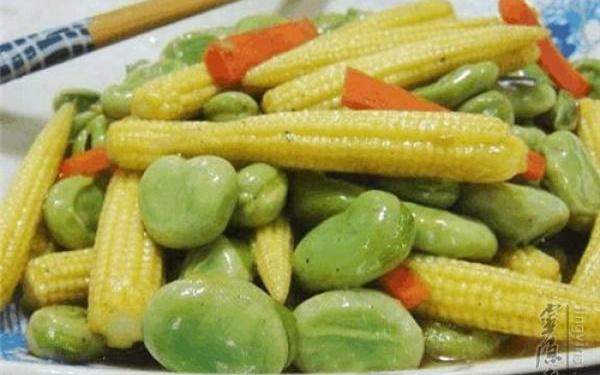 【原料】:玉米笋、蚕豆、胡萝卜 【做法】: 1、胡萝卜洗净去皮,切成长条;其他两样洗净备用。 2、起锅热油,爆香姜末,将以上三种材料一起入锅爆炒,加适量水焖3-5分钟,用盐、蘑菇精、少许白糖调味。待汤汁略收干后即可出锅。 【温馨提示】: 1、蚕豆不可生吃,应将生蚕豆多次浸泡或焯水后再进行烹制。 2、不可多吃,以防胀肚伤脾胃。 &nbs