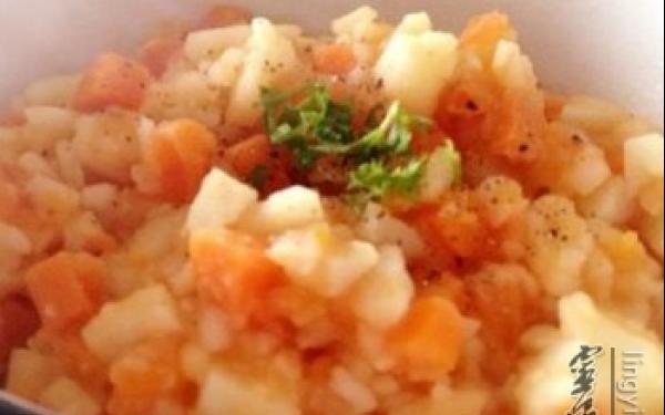 马铃薯的营养成分非常全面,富含维生素B、维生素C以及各种矿物质。土豆含水量高达70%以上,真正的淀粉含量不过20%左右。土豆仅含有0.1%的天然脂肪,多吃也不必担心脂肪过剩。 【主料】:土豆 一个大的、胡萝卜 半个、西红柿 一个、胡椒碎 少许、盐 少许 【做法】: 1、土豆,胡萝卜,西红柿洗净切丁备用。 2、 将土豆丁放入装有冷水的碗中浸泡,待土豆里的淀粉在水中散开(水呈浑浊状),挡住土豆,把水倒掉