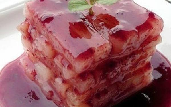 【原料】:山药 200g 蓝莓酱 1勺【辅料】:柠檬汁 4ml 【做法】:1.山药去皮,切成条,然后用水浸泡烧水。 2.把山药煮熟,只要熟了就行,不要煮久了,不然就不脆了。 3.煮好之后,一定要用冷水冲,把它的温度降下来,晾干水分,里面加入柠檬汁。 4.开始摆盘,一排横向的,一排纵向的摆,最后淋上蓝莓汁即可。